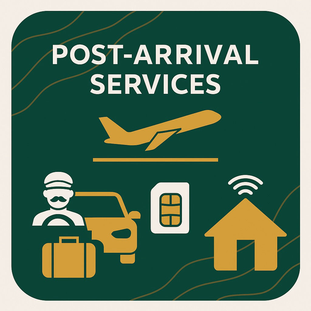 We provide airport pickup, temporary housing, SIM cards, utilities setup, drivers, and orientation support.